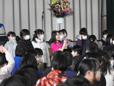 講演の最後には、すわ様と児童全員で「夢をかなえてドラえもん」を合唱し、歌声が会場いっぱいに広がりました。