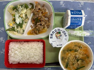 今日の食材で栃木県産のものは、①牛乳、②こめ、③キャベツ、④玉ねぎ、⑤きゅうり、⑥にら、⑦しいたけ、⑧にんじん、⑨ピーマン、⑩アスパラガス、⑪豚肉、⑫卵でした!