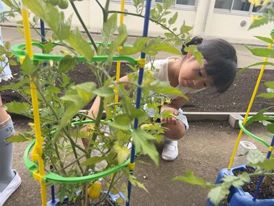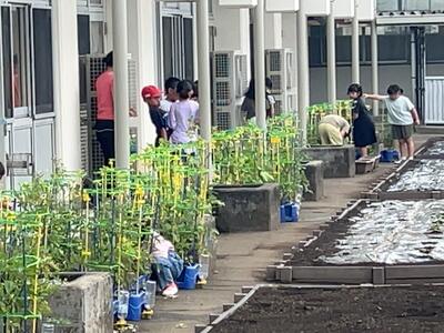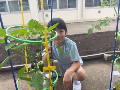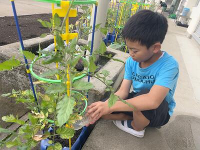 2年生では、生活科の学習で野菜の栽培に取り組んでいます。今年もそれぞれの鉢にミニトマトやピーマン、ナスなどを植え、毎朝登校後には「今日はどうなってるかな?」と目を輝かせながら水やりや観察を行っています。
