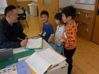 グループをつくり、班長を決めて、学校内を探検しました。それぞれの場所でスタンプやサインをもらいました。