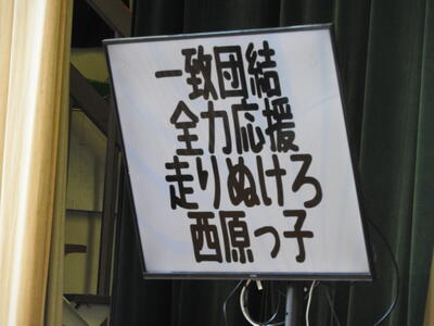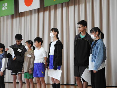 その後、5月25日(土)に予定されている、運動発表会のスローガン『一致団結 全力応援 走りぬけろ 西原っ子』が発表されました。