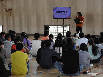 指導では、まず「清掃の仕方や服装の約束」について確認しました。雑巾はきちんと絞って使うことやワイパー拭きの方法、ほうきは静かに使うこと、服装は動きやすく安全なものにすることなど、一つひとつスライドや動画を使って伝えられました。
