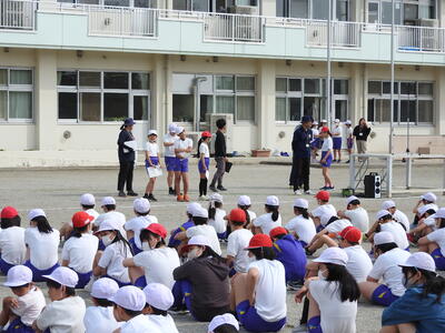 避難後、校長先生からは「命を守るための行動は、最初の3秒がとても大事です」というお話がありました。「自分の身を守るためにどう動くかを、ふだんから考えておくことが大切です」との言葉に、子供たちも真剣な表情で耳を傾けていました。
