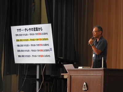 今日の朝会では、校長先生から夏休み明けてからの1週間を、これまでの生活を振り返るお話がありました。マザー・テレサの次の言葉を紹介してくださいました。
