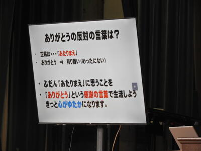 校長先生は、日々の思考が言葉となり、やがて行動や習慣を形づくり、自分自身の生き方につながっていくことを教えてくださいました。さらに「普段『あたりまえ』と感じていることも、本当は『あたりまえ』ではなく、『有り難し』(めったにないこと)かもしれません。周りの人や出来事に感謝しながら生活していきましょう」と話されました。