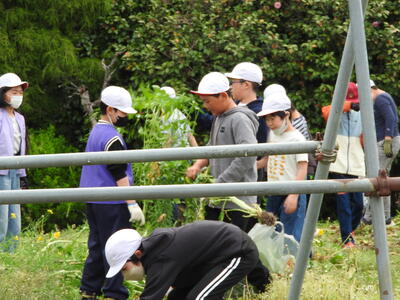 初夏を感じるの日差しの中、全校児童でクリーン活動を行いました。「よーし、がんばるぞ!」とやる気いっぱいでスタートした子供たち。花壇や農園に向かって、さっとしゃがんで夢中で取り組み始めました。