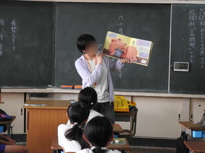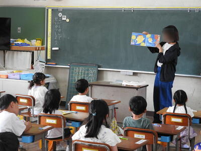 子供たちが毎回楽しみにしている図書ボランティア「ムーミン」さんによる読み聞かせが行われました。