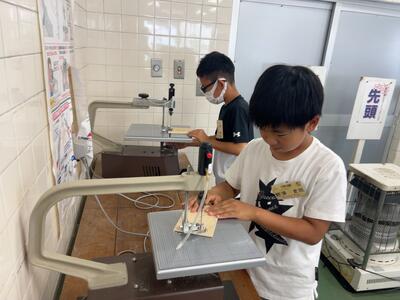 5年生の図工では、糸のこぎりを使って木工作品の制作に取り組んでいます。