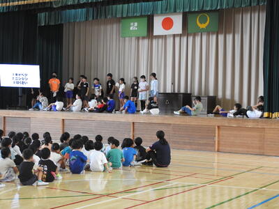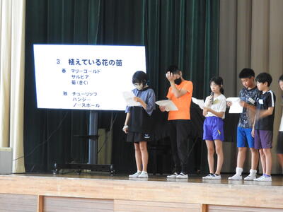 今回の児童集会は、緑化委員会が実施しました。学校で大切に飼育しているウサギの習性や食べ物、名前に関するクイズが全員参加形式で行われ、会場は大いに盛り上がりました。