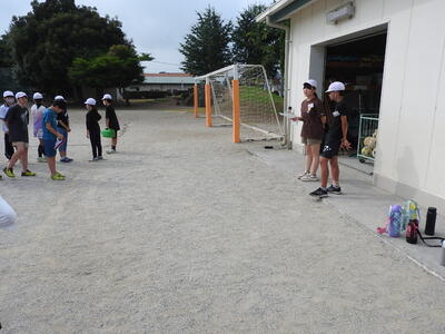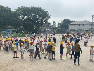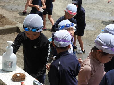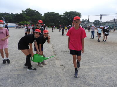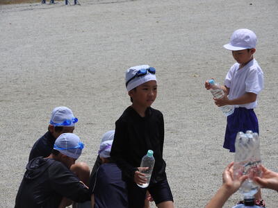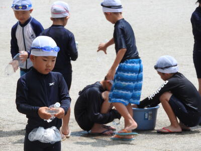 1年生が生活科の学習で水遊びを行いました。初めての校庭での水あそびに、子どもたちは朝からワクワク!準備体操をしっかり行い、いよいよ活動がスタートしました。
