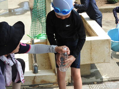 ペットボトルやバケツを使っての水のかけ合いや、バケツを使っての水の移し替え遊びなど、遊びながら水の性質を体感。「冷たくて気持ちいい!」と、あちらこちらから楽しそうな声が響きました。