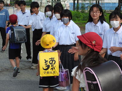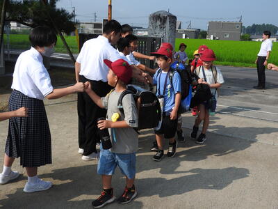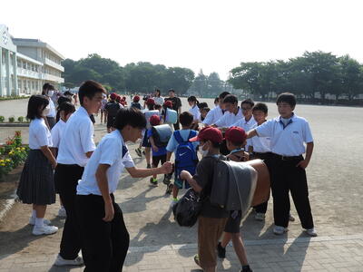 2回目ということもあり、児童も笑顔であいさつしたり手を伸ばしてハイタッチやグータッチをしに行ったりと、中学生とのあいさつを楽しんでいる様子でした(^^)