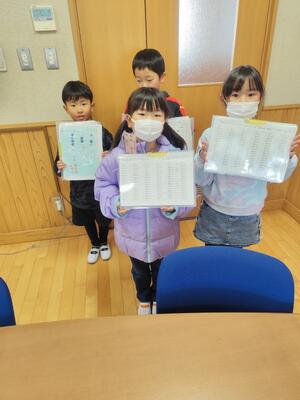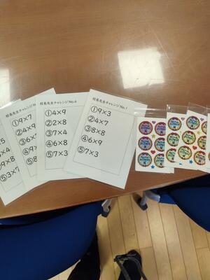 教室で友達や先生と九九の練習をして、自信が持てたら校長室に来て問題カードを引き九九チャレンジをします。