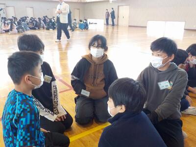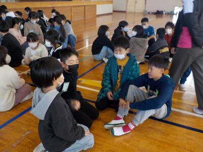 体育館へ入り、紫塚小学校の5年生と対面すると、少し緊張した様子でした。