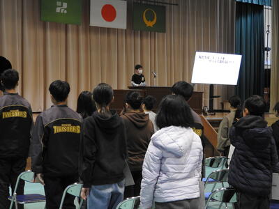 練習の中では、式歌の歌い方や礼の仕方などについても指導がありました。歌声をそろえることや、気持ちを込めて歌うこと、相手に思いが伝わる礼の仕方など、大切なポイントをみんなで確認しました。