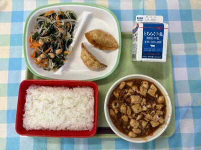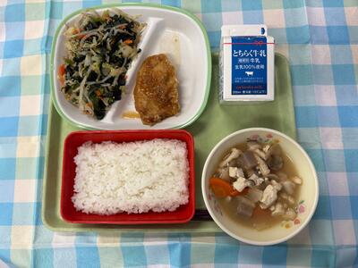 今日の地場産物・・・牛乳、米、キャベツ、ごぼう、大根、にんじん、ねぎ、もやし、しいたけ、油揚げ、豆腐、ほうれん草